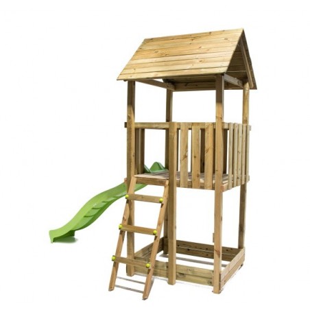 - Versión con Casita: En esta versión, la base se cierra para crear una encantadora casita con puerta y ventana. El acceso a la plataforma de 120 cm de altura se realiza mediante una escalera, y la bajada es por el tobogán, garantizando horas de juego y diversión.