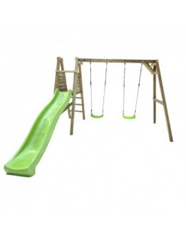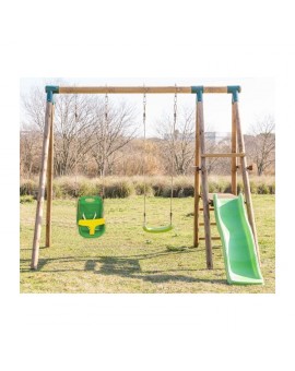 MILOS structure consists of a double swing and slide platform, good quality with a good price. Includes: - 2 plastic seats with strings - 1 climbing rope - 1 set of corners and anchors You can attach a hose to the ramp to make a water...