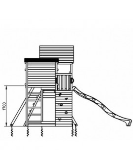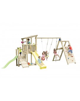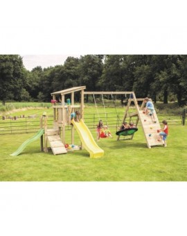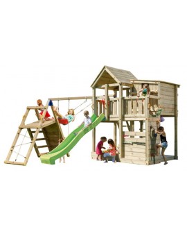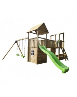 Spectacular tower with several integrated elements, it is so big that children will never get bored! It has a large platform with balcony on the side, and is connected to a small house to hide. Below, there is a huge sandbox and a resting area...