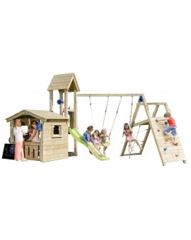 The KIOSK tower is a tower that offers very good value for money, this combination includes the @Challenger that incorporates a rope ladder, a climbing ramp and a double swing. This playpen is made of square wood and has an excellent finish....