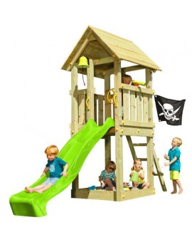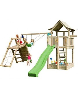 Spectacular tower with several integrated elements, it is so big that children will never get bored! It has a large platform with balcony on the side, and is connected to a small house to hide. Below, there is a huge sandbox and a resting area...
