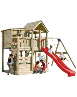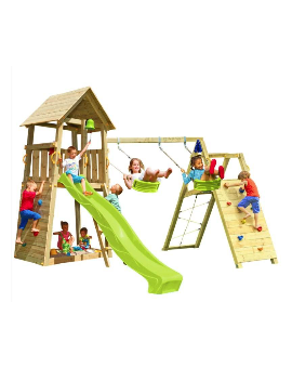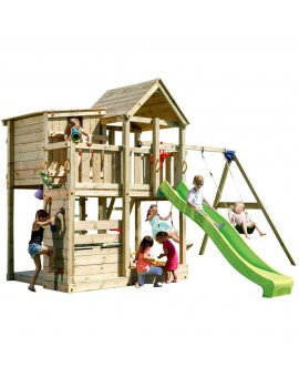 Spectacular tower with several integrated elements, it is so big that children will never get bored! It has a large platform with balcony on the side, and is connected to a small house to hide. Below, there is a huge sandbox and a resting area...