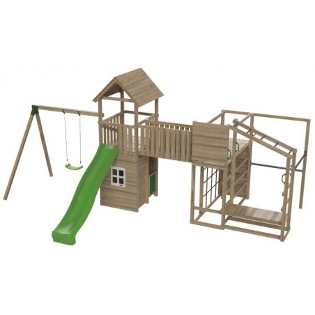 El parque infantil TALAIA con columpio doble es un parque fabricado en madera de calidad muy resistente. Los niños podrán subir a la torre por las escaleras de madera y una vez arriba podrán jugar en la plataforma y bajar deslizándose por la...