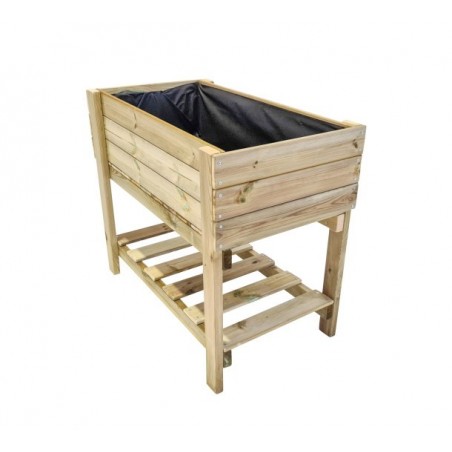 La mesa de cultivo MASGAMES ALTA está elevada para que no tengas que doblar la espalda al trabajar con tu huerto urbano y tiene una repisa en la parte inferior de la maceta para poder guardar utensilios de jardinería.