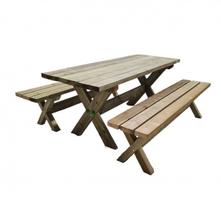 Tavolo da picnic realizzato in legno di pino di alta qualità trattato con autoclave di livello IV, adatto per stare all'aperto e all'aria aperta. È realizzato in legno di 45 mm di spessore (120x45 mm) e presenta un doppio rinforzo alla base...